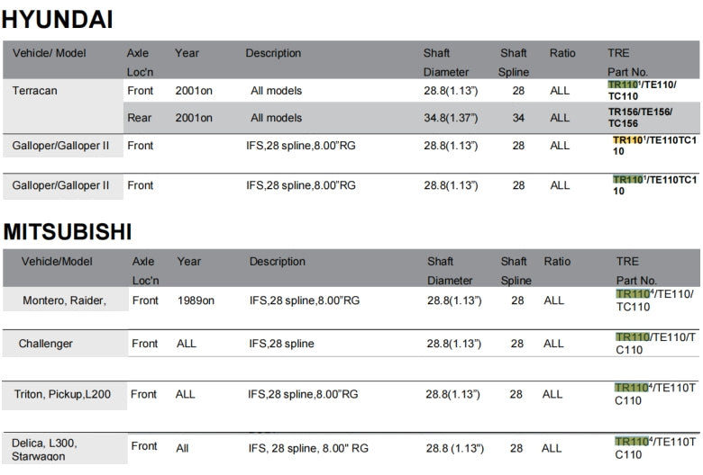 Application Chart TRE4x4 Locker Deffirential Catalog