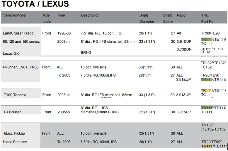 Application Chart TRE4x4 Locker Deffirential Catalog