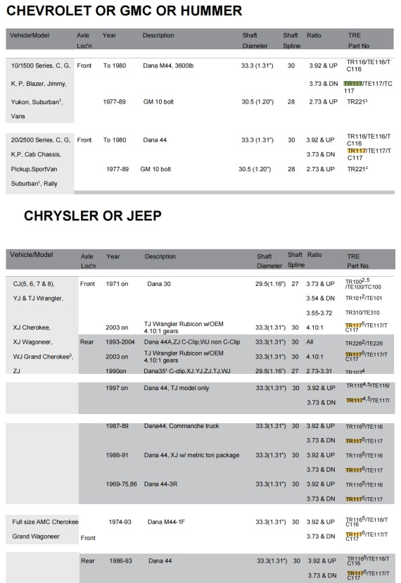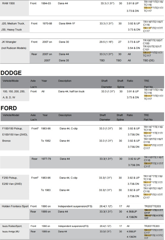 Application Chart TRE4x4 Locker Deffirential Catalog