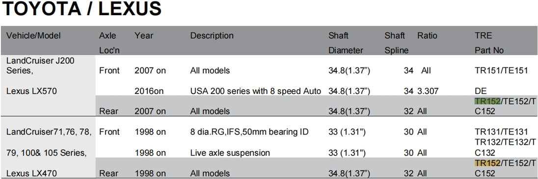 Application Chart TRE4x4 Locker Deffirential Catalog