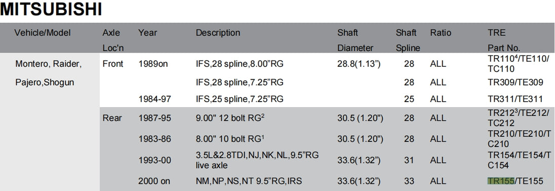 Application Chart TRE4x4 Locker Deffirential Catalog