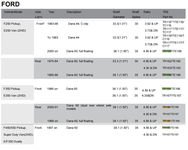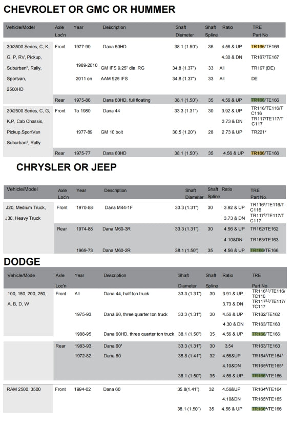 Application Chart TRE4x4 Locker Deffirential Catalog