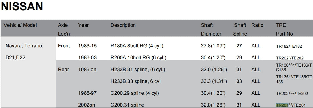 Application Chart TRE4x4 Locker Deffirential Catalog
