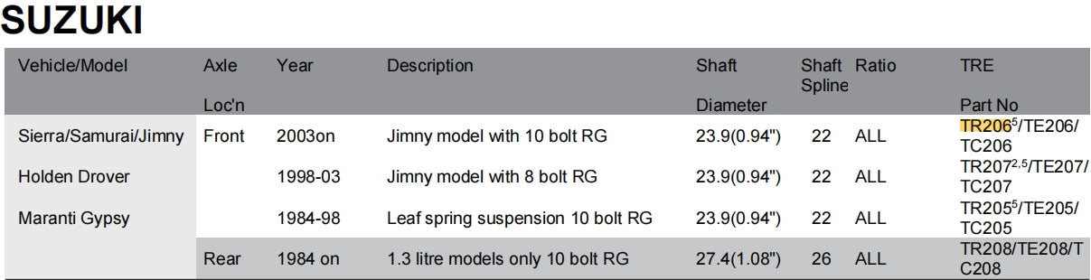 Application Chart TRE4x4 Locker Deffirential Catalog