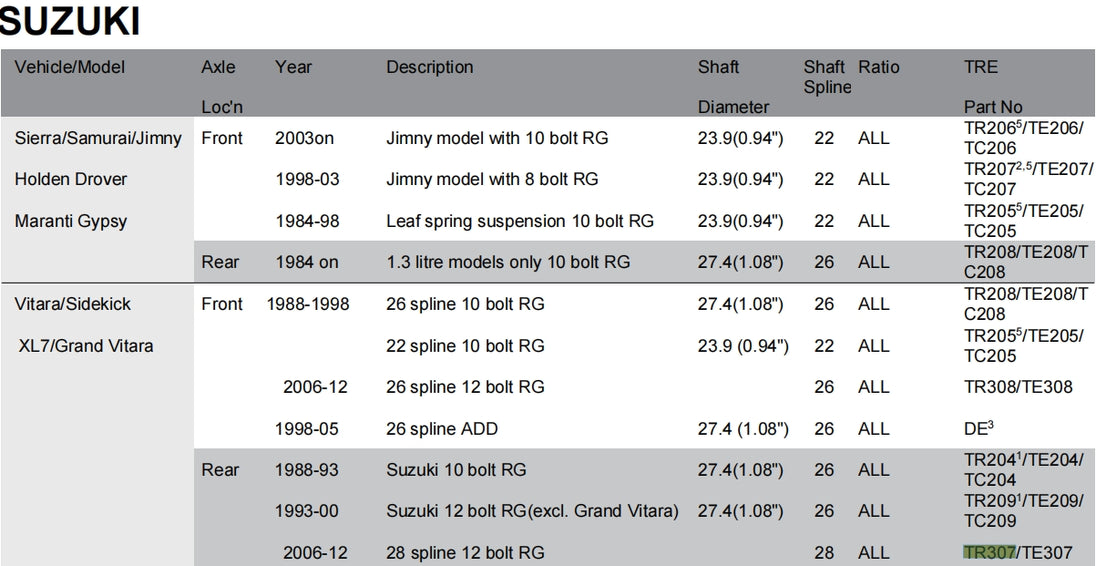 Application Chart TRE4x4 Locker Deffirential Catalog