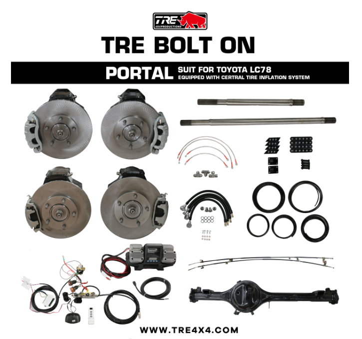 The intesration of TRE4x4 bolt-on portals with Central Tire Infiation Systems (CTIS) enhances vehicle mobillty and performance in challenging terrains.This system allows for dynamic adjustments to tire pressure,maximizingadaptability to varying conditions.